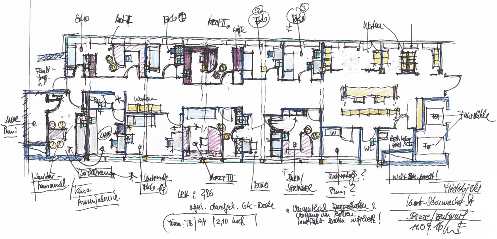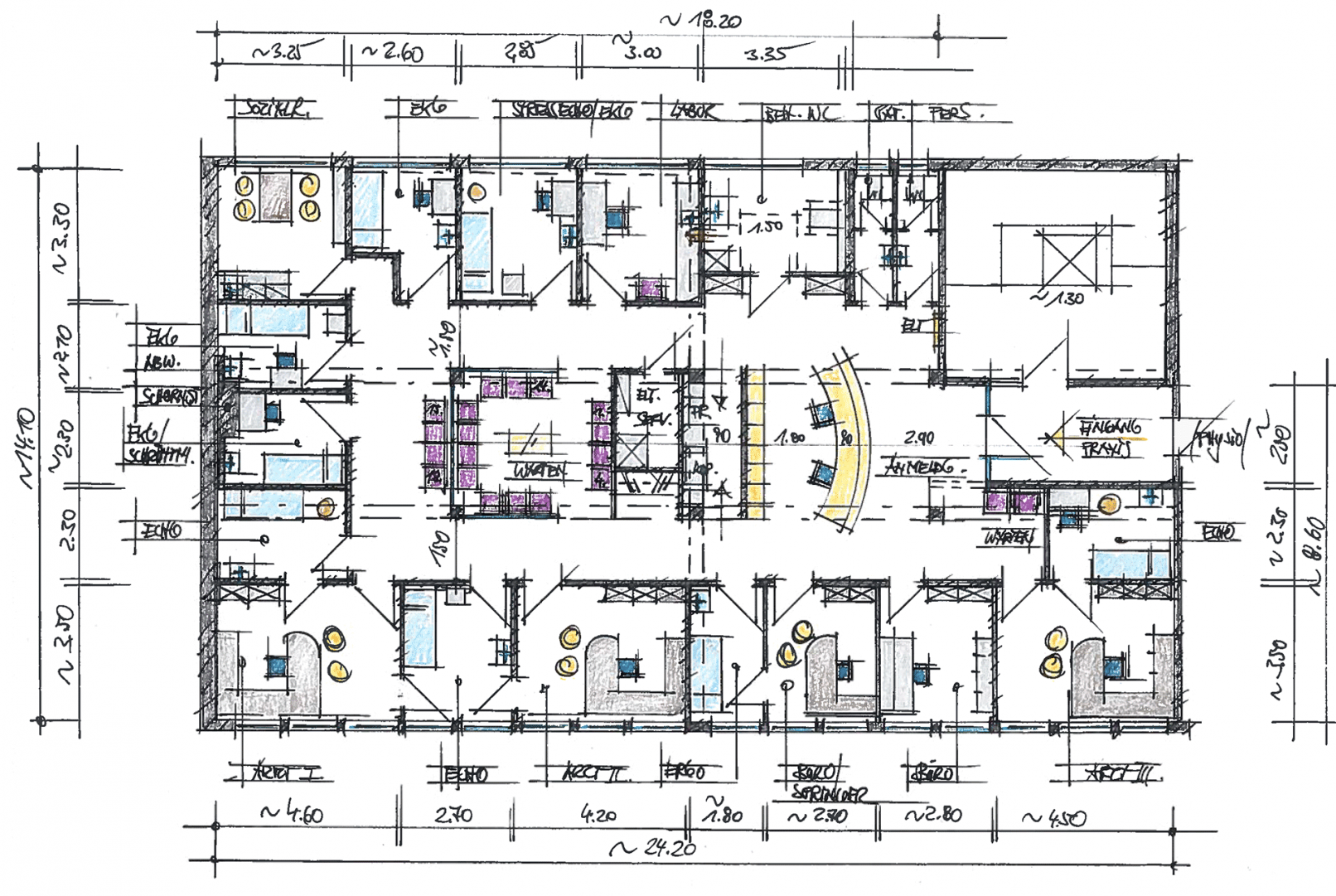 Entwürfe zur Umnutzung der Räumlichkeit für eine Kardiologische Praxis bei unterschiedlichsten Raumbedingungen.
